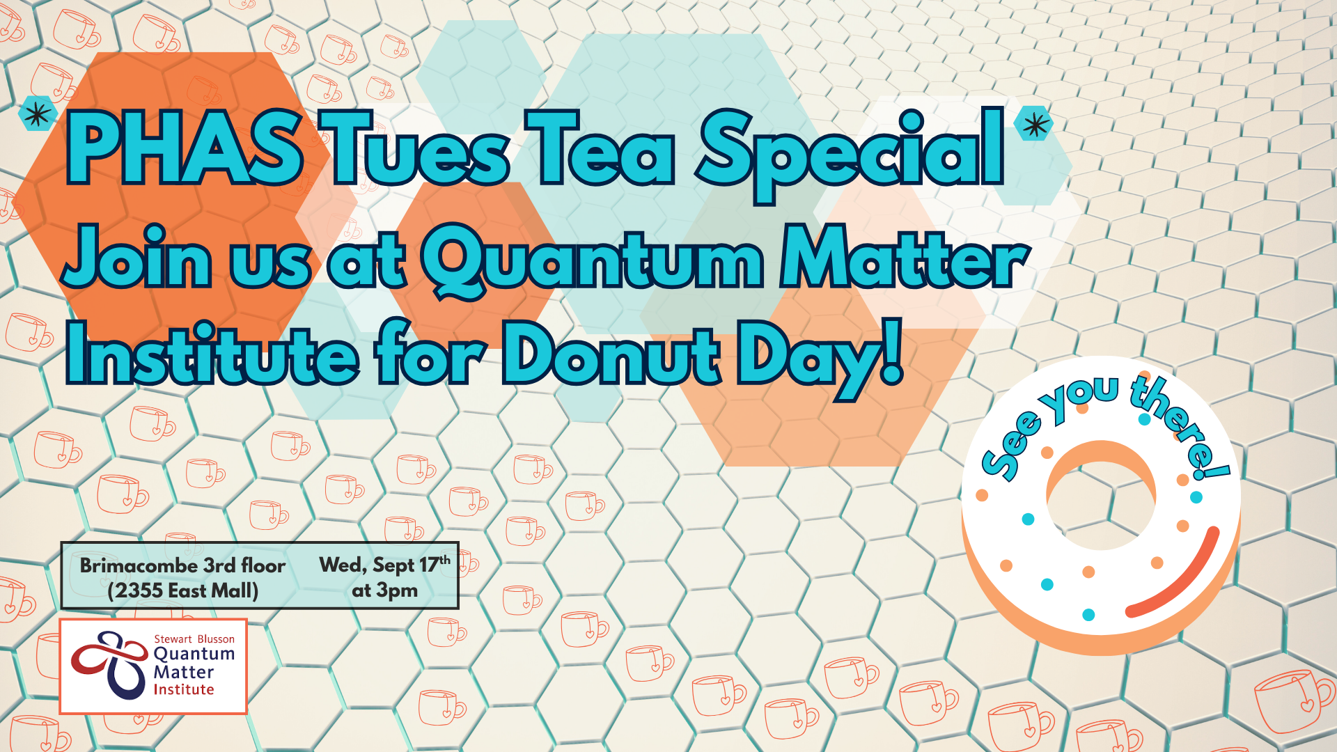 PHAS students, post-docs, faculty and staff: Come join us at the Brimacombe Building (2355 East Mall) - (approximately 700m from Hennings, or a 4min walk) for some tasty treats! QMI is happy to host as many of us that will make the trek with coffee, tea, timbits, cookies, fruit, and more!