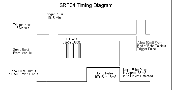 The SRF04 Timing diagram is shown below. You only need to supply a short 10uS pulse to the trigger input to start the ranging. The SRF04 will send out an 8 cycle burst of ultrasound at 40khz and raise its echo line high. It then listens for an echo, and as soon as it detects one it lowers the echo line again. The echo line is therefore a pulse whose width is proportional to the distance to the object. By timing the pulse it is possible to calculate the range in inches/centimeters or anything else. If nothing is detected then the SRF04 will lower its echo line anyway after about 36mS.