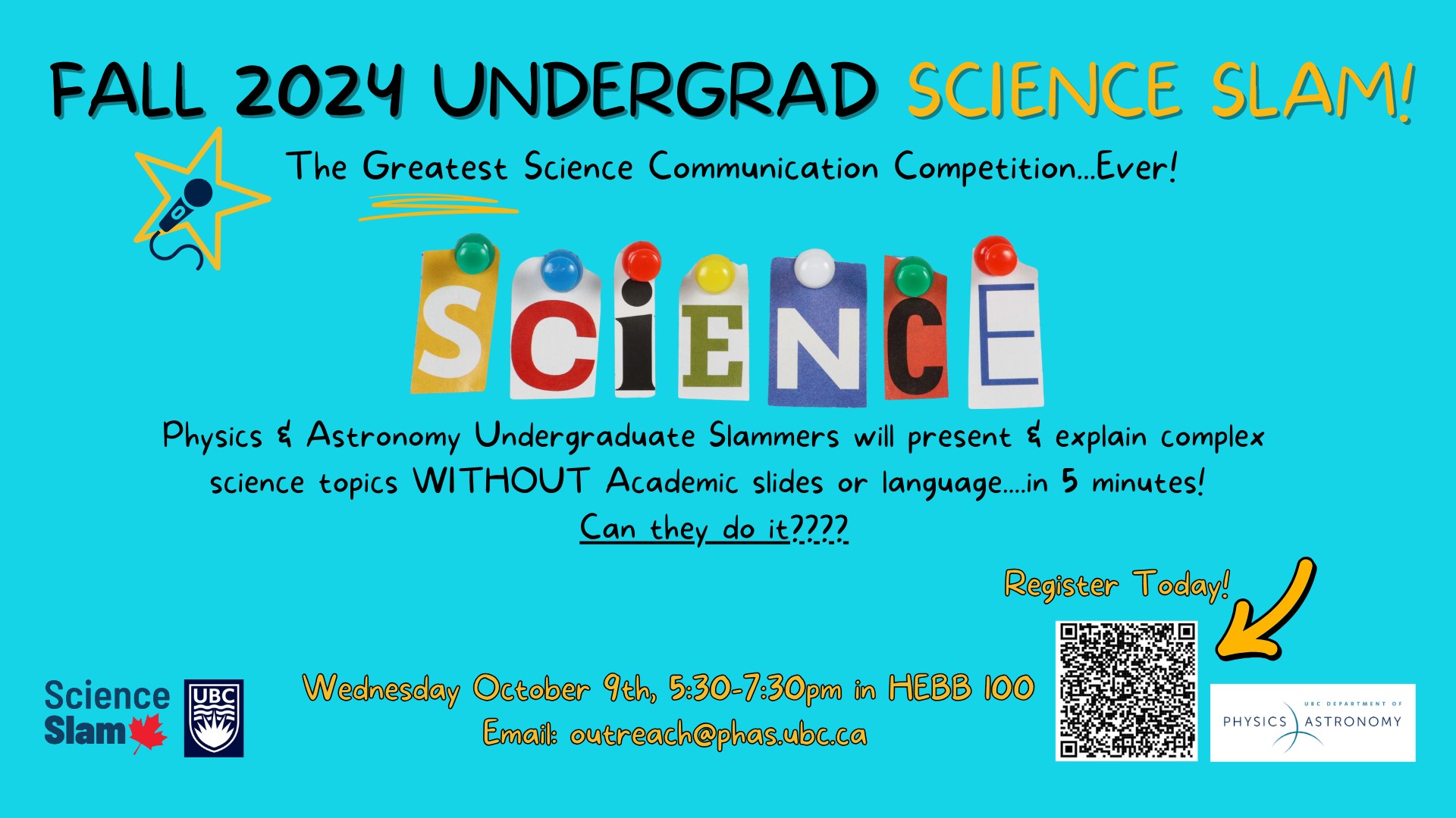Join us for this thrilling and educational science communication contest, showcasing six undergraduate student presenters explaining complex physics and astronomy topics without the use of academic or technical language/slides.